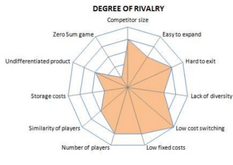| Degree of Rivalry Low switching cost for the customers to move from one party to another create the high competition amongst each other’s in the industry. Easiness of the expansion low storage cost lack of diversity increase the rivalry against each other companies. | ![]() |